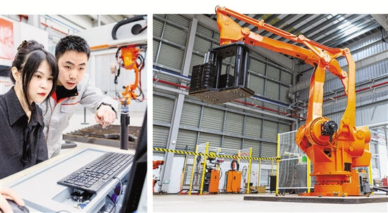 左图为记者(前)在工作人员指导下操作智能焊接机器人。右图为800公斤码垛机器人在测试。 共享联盟·温岭 徐伟杰 摄