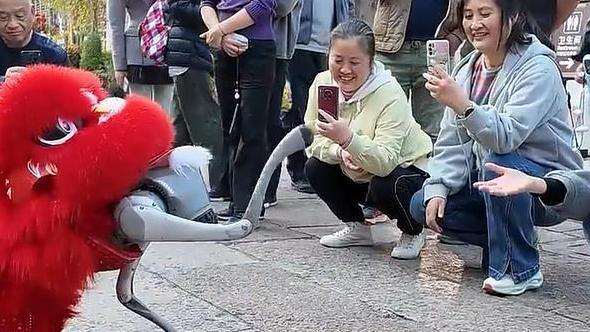 表演现场,机器狗的灵动表现圈粉无数。察觉到游客伸手,它会立刻停下脚步乖巧握手,二郎神轻抬手势,它便顺势趴在青石板上装睡,下一秒又突然弹起完成跳跃,金属关节转动的精准度令人称奇。引得观众纷纷举手机拍摄。“本来是来逛古城的,没想到偶遇这么有意思的表演,这哮天犬比动画片里还会营业。”来自杭州的游客李女士笑着说,孩子追着机器狗跑了整条街。