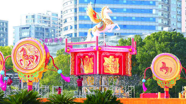 昨天,记者来到绣湖广场,只见一座大型走马灯已初具雏形。工人们正在调整灯饰细节,确保每一组线条都完美无缺。“主景是高15米的走马灯,上方白色的飞马振翅欲飞,象征义乌人民‘一马当先’的开拓精神。”义乌市建设局园林绿化处相关负责人介绍,这组灯名为“马耀华章 潮起新春”,将由4个镶嵌鎏金八骏图的大型拨浪鼓灯组环绕,寓意商通天下;两侧设有鲲鹏化船的花灯造型,寓意义乌商贸扬帆出海。同时,广场内还在搭建“有情有义 世界义乌”“真理的味道”等多个主题灯组。
