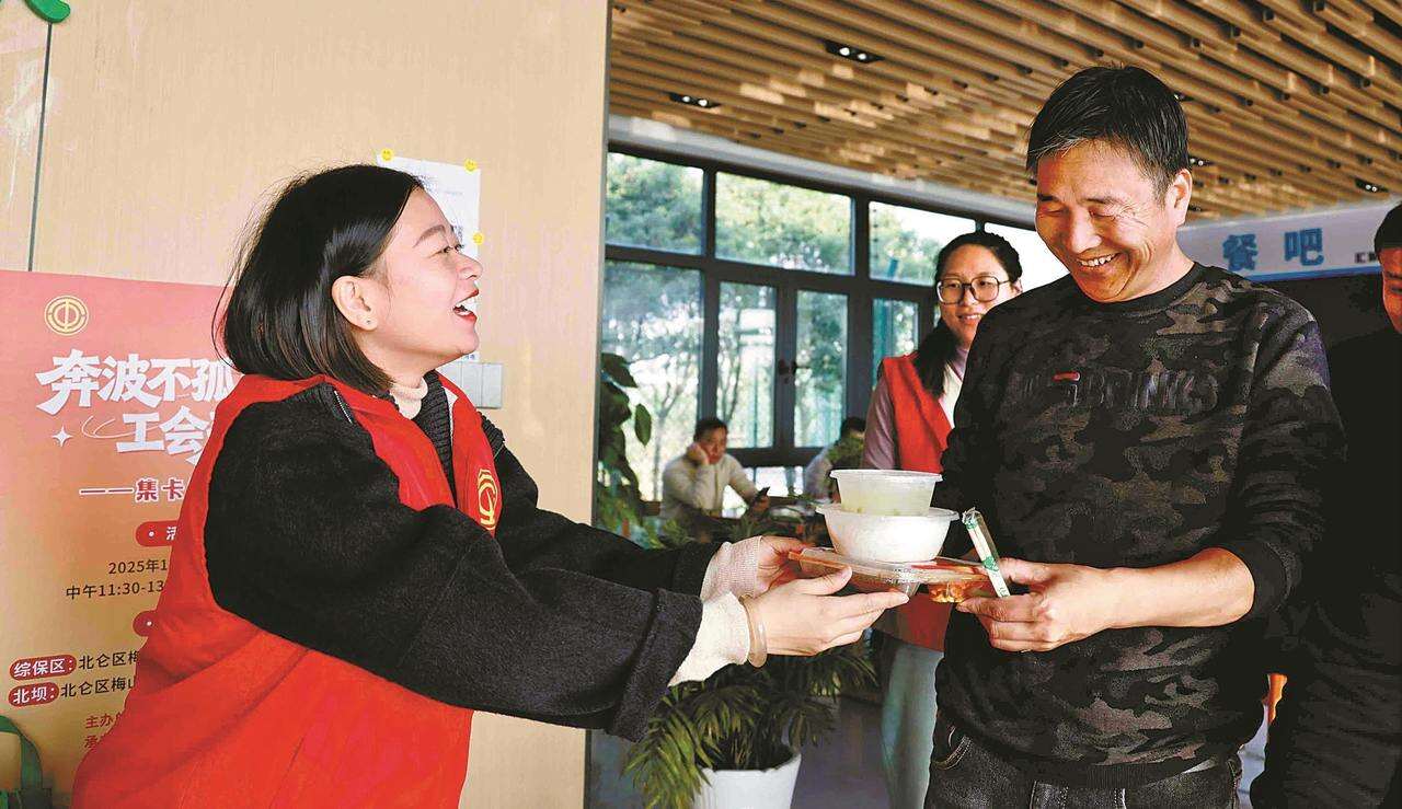 12日中午,宁波北仑梅山综保区停车场内暖意渐浓。刚停稳车辆的集卡司机王师傅,从金创工业社区志愿者手中接过热气腾腾的饭菜。