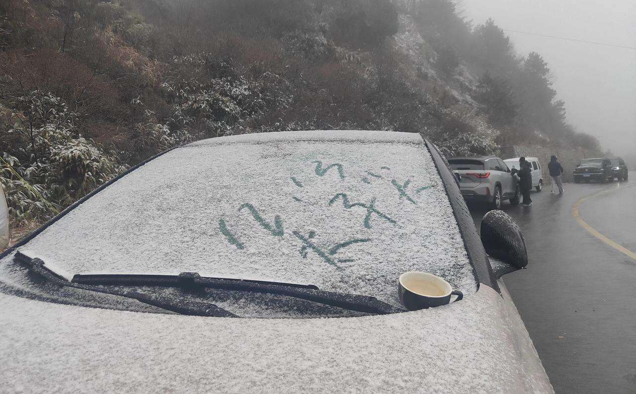 他说,太子尖驿站附近,大概9点多开始飘雪,大雾、湿冷、体感温度大概在零下。不过,因为太子尖暂时封闭,游客并不多,只有驿站路边停放了一些车,很多都是特意赶来追雪的。