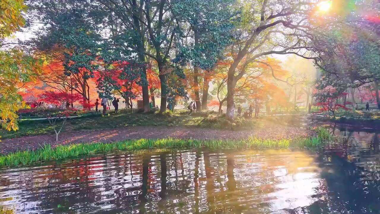 杭州太子湾的深秋初冬 湖水如镜 红枫似火