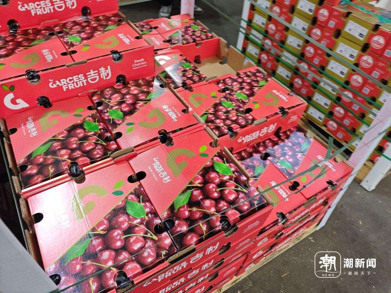 位于逸盛路上的勾庄水果批发市场,半数以上的档口都把整箱的车厘子摆在显眼位置。