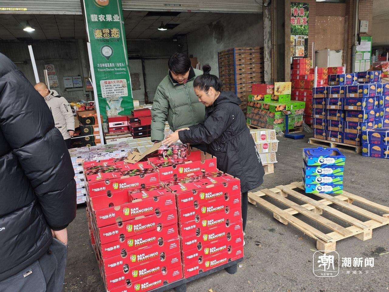 “前两天就听说车厘子降价了,我们家孩子很喜欢吃,今天打算过来买一箱回去尝尝鲜。”在一个档口前,黄女士一边仔细查看车厘子的品相,一边向档口的老板询问价格。