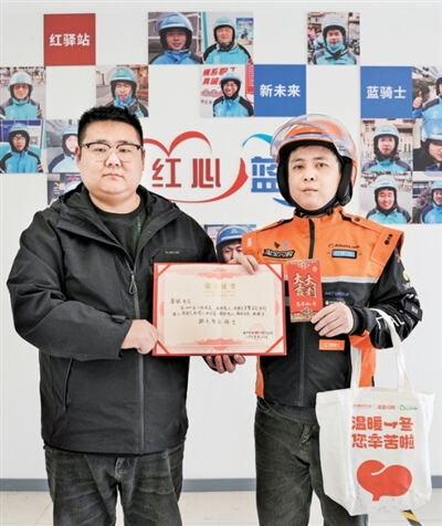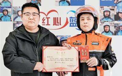 12月10日下午,李斌来到骑手驿站,柯桥区外卖行业工会委员孙伟迎了上来,为其颁发一本荣誉证书和一个红包。翻开证书,上面写着“你用自己的爱心和力量帮助他人,服务社会……”柯桥区外卖行业工会授予其“助人为乐骑士”荣誉称号,表彰其挺身而出的担当精神。