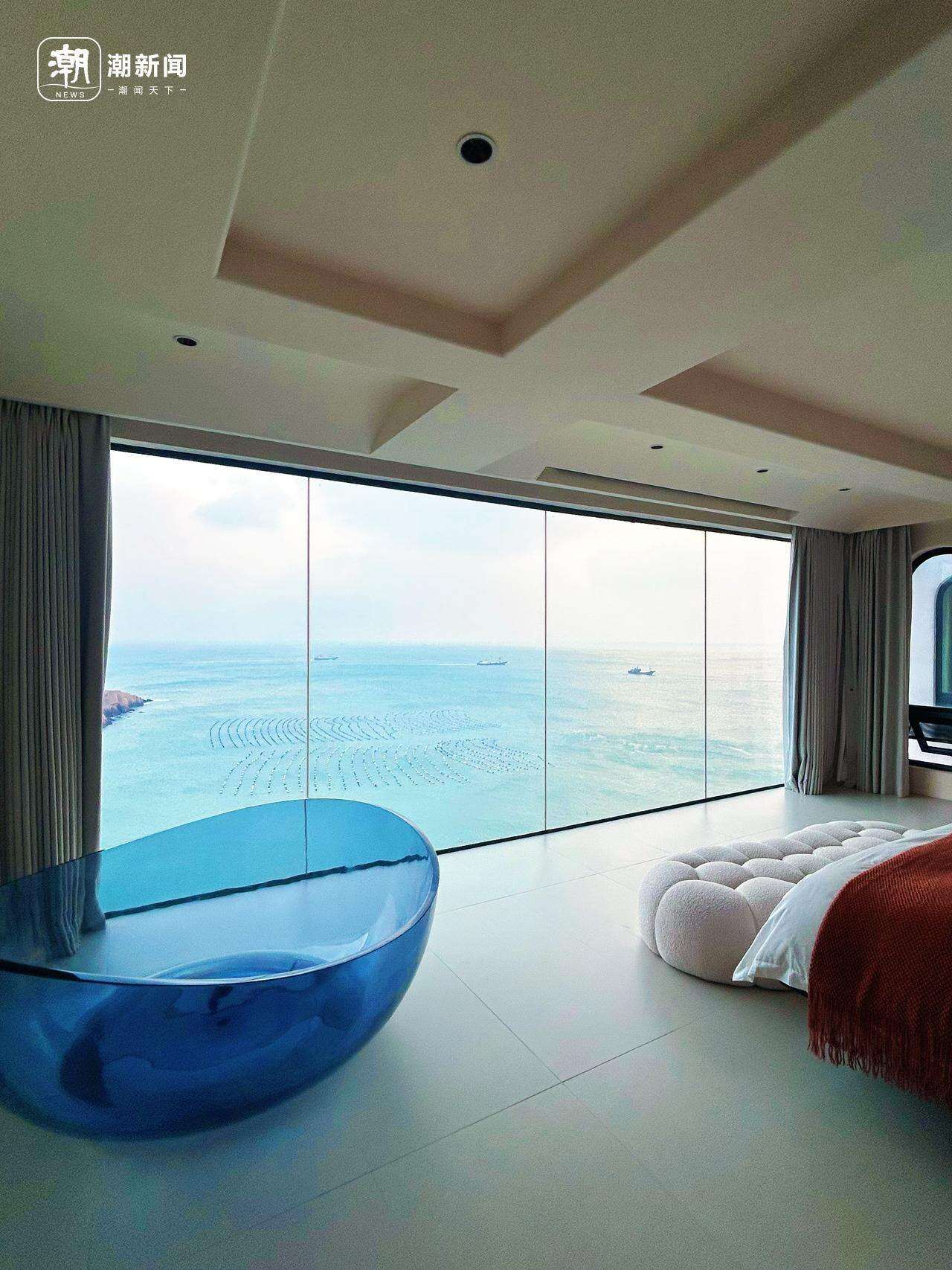 泳池洞穴花园房、悬浮浴缸房、泡池房,还有流线型台阶、热带雨林般的大厅,直面浩瀚东海的室外草坪,ins风的装修风格……民宿的每个角落都超级出片。坐在民宿大厅的超广角落地窗前,点一杯咖啡或莫吉托,任日色慢慢流淌,看海影千重变幻,慵懒时光在此刻被无限拉长。