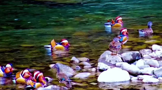 据悉,鸳鸯是雁形目鸭科动物,主要栖息于山地河流、湖泊、水塘、芦苇沼泽和稻田中。在碧绿、清澈的雁湖里,“回家”的鸳鸯们憨态可掬,在碧绿的湖水里觅食嬉戏。它们时而站在岸边,梳理羽毛;时而在水里,互相追逐;时而相依小憩,耳鬓厮磨……为这幅山水大画卷增添了不少生机与灵动。