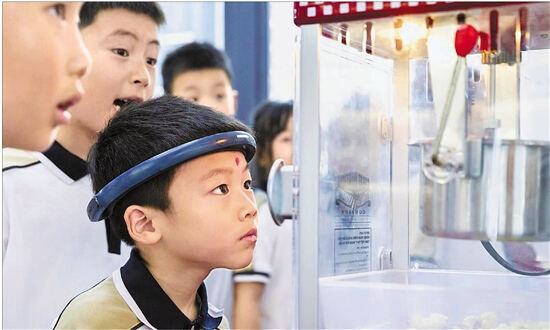 小学生佩戴脑机接口设备,用意念制作爆米花。 记者 金鹏 摄