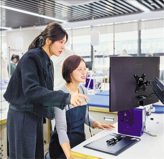 “让AI听懂我们的指令,恰恰是人工智能背景下服装设计课的重点。”尤杨一语道破了关键。过去学生在完成样衣后,需自己动手在电脑上绘制纹样,再采购面料裁剪制作,才能看出设计效果。受限于学生绘制技术、面料选取的局限性等,一个设计周期长达一个月,真正用于激发创意的时间反而很少。2022年开始,学校尝试AI教学。现在,学生完成样衣制作后,用AI设计平台,将重复性的工作交给AI,把最宝贵的精力投入到创意构思与审美决策中。学校的服装设计专业还因此成为教育部人工智能赋能教育行动试点。