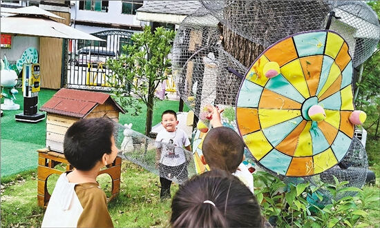 幼儿园内,随处可见山楂、梨、柚子等各种水果树,还饲养着鸡、鸭、湖羊等动物。在“童年有一百种模样”的展览墙上,张贴着幼儿园孩子四季活动的照片:种水稻、做糖葫芦、蒸地瓜…… 卢金燕说:“我们陪着孩子在自然生态园里游戏,希望孩子能在自然中释放天性,用眼睛和双手慢慢探索世界。”