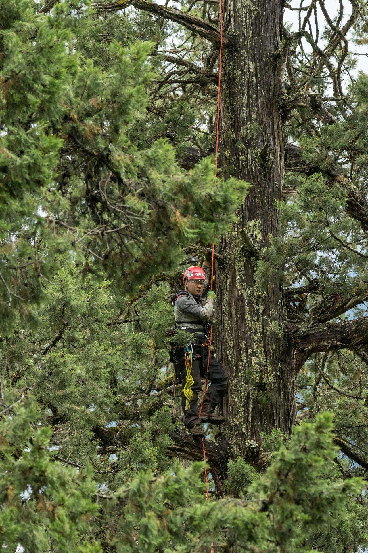 钟鑫正在攀爬藏南柏木。 受访者供图