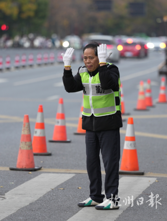 护岗时,吴斌穿着反光背心,戴着白手套,根本看不出是一位校长。他在斑马线上来回走动,手臂抬起又放下,哪怕前方没有来车,他也会伸出左手,右手招呼孩子快步走。