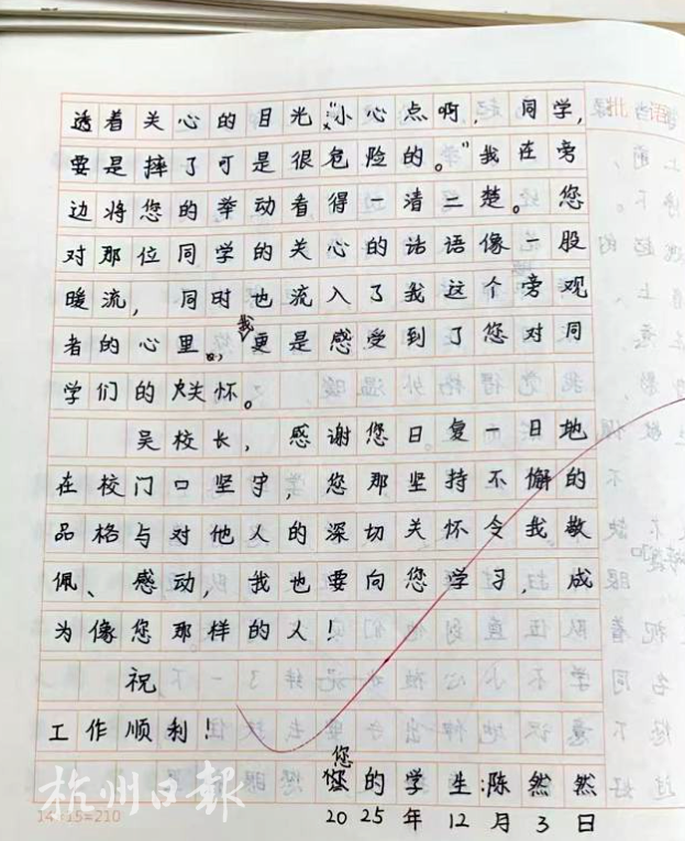 学校老师也告诉记者,到了冬天,吴校长的护岗会更加认真。“学校本身位置就较偏,加上天气一冷,家长都选择开车接送。因此冬天的早晨校门口往往更拥堵。吴校长也知道这一点,所以丝毫不敢怠慢。”