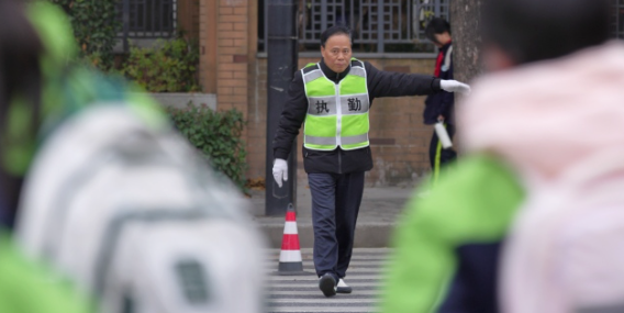 如今,学校领导和学生家长每天早晨也会来到门口和他一起护岗,马路两边都有人在,也更加安全。