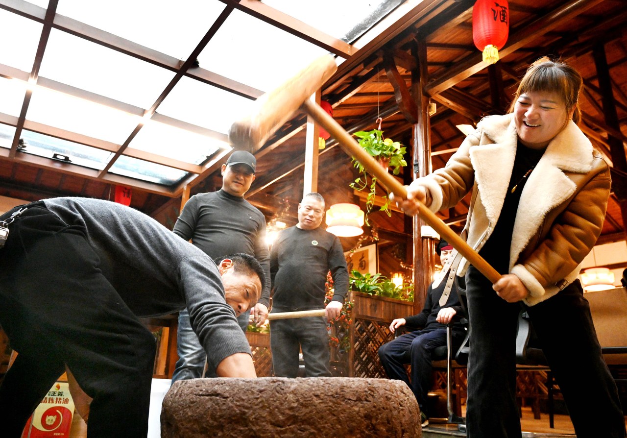 12月21日,市民和游客在金华市武义县南唐食府农家乐开心体验传统的手工石臼打糍粑。12月20日至21日,武义县南唐食府农家乐举行冬至美食制作活动,员工与游客一起切冬米糖、打糍粑、做冬至馃,体验传统习俗。拍友 张建成 李云升 摄