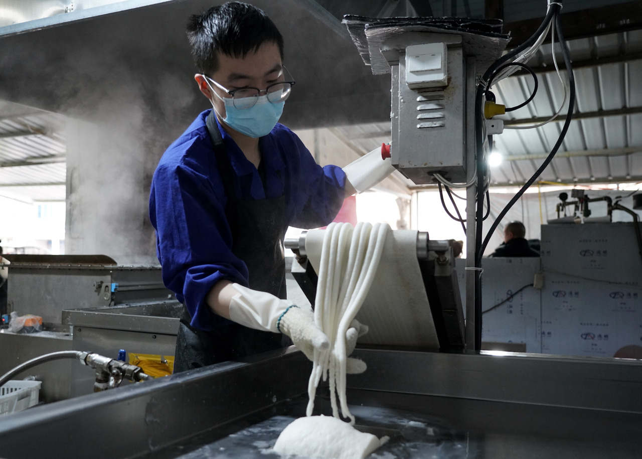 12月21日,乐清市城东街道蛎灰窑年糕加工坊的村民在制作年糕。南方一些地区,冬至吃年糕是重要习俗。拍友 蔡宽元 摄