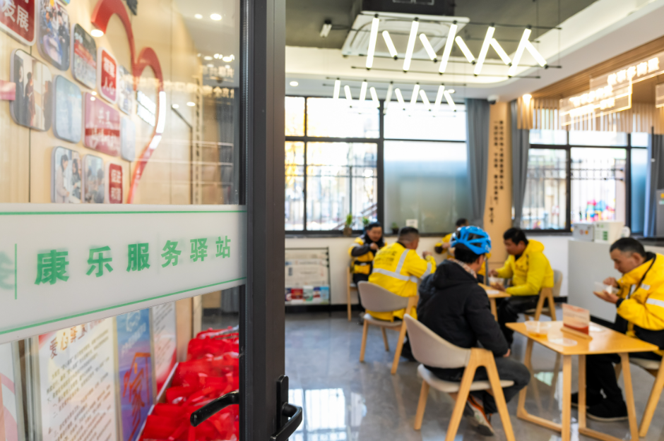 驿站虽小,功能齐全。以“庐语”驿站为例,空调、微波炉、饮水机、充电设备、医药箱、雨衣等便民设施一应俱全,有效解决了户外劳动者热饭难、充电难、休息难等问题。在满足基础需求的同时,各驿站还注重差异化服务,针对不同群体优化配置。