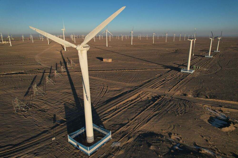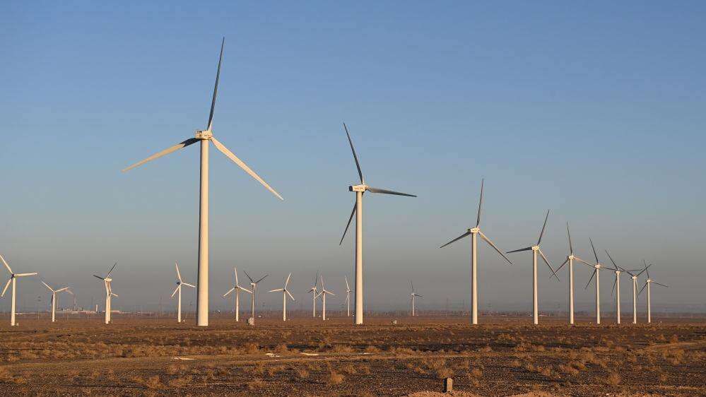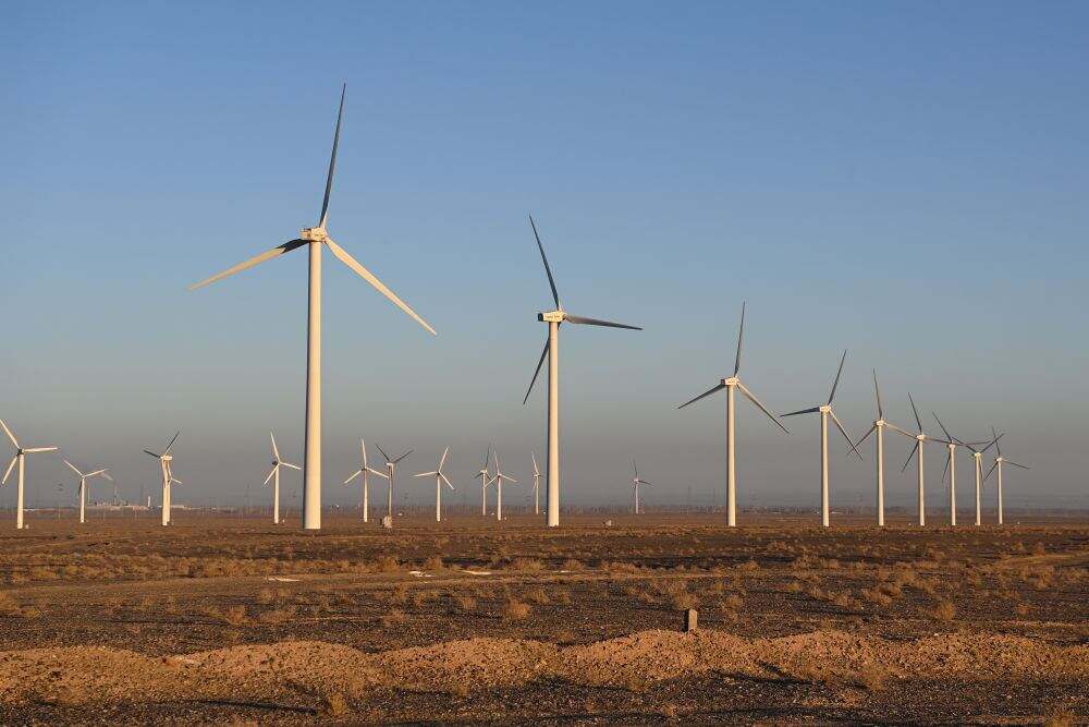 甘肃省玉门市戈壁滩上的风电机组。图源新华社