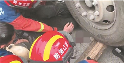 参与救援的消防员朱林春回忆,当时被困伤者意识尚存,但神情麻木,右腿已经被车轮压得变形,“时间拖得越久,对伤者的伤害也越大,必须尽快把他救出来。”