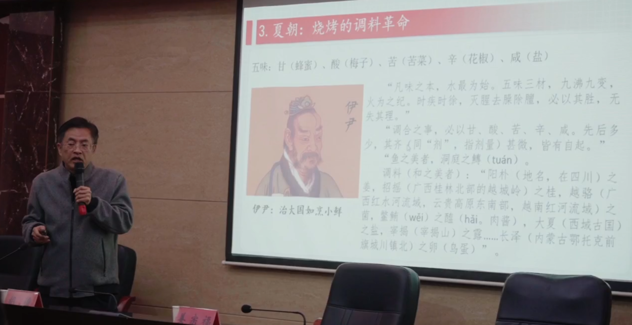 姜宗福在首届烧烤精英学历提升班开班典礼上,讲的第一堂课《岳阳味道的中国烧烤通史》。受访者供图