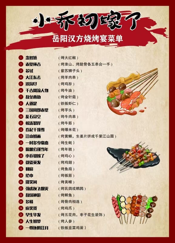 《“小乔初嫁了”岳阳汉方烧烤宴》菜单。受访者供图