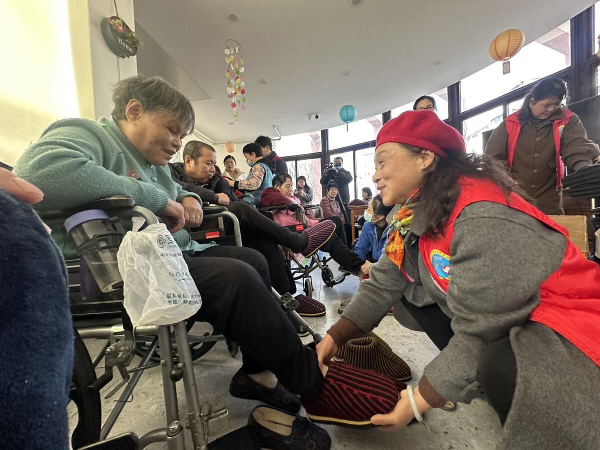上午,为老服务中心里阳光正好。志愿者们蹲下身,帮老人们试穿新鞋。