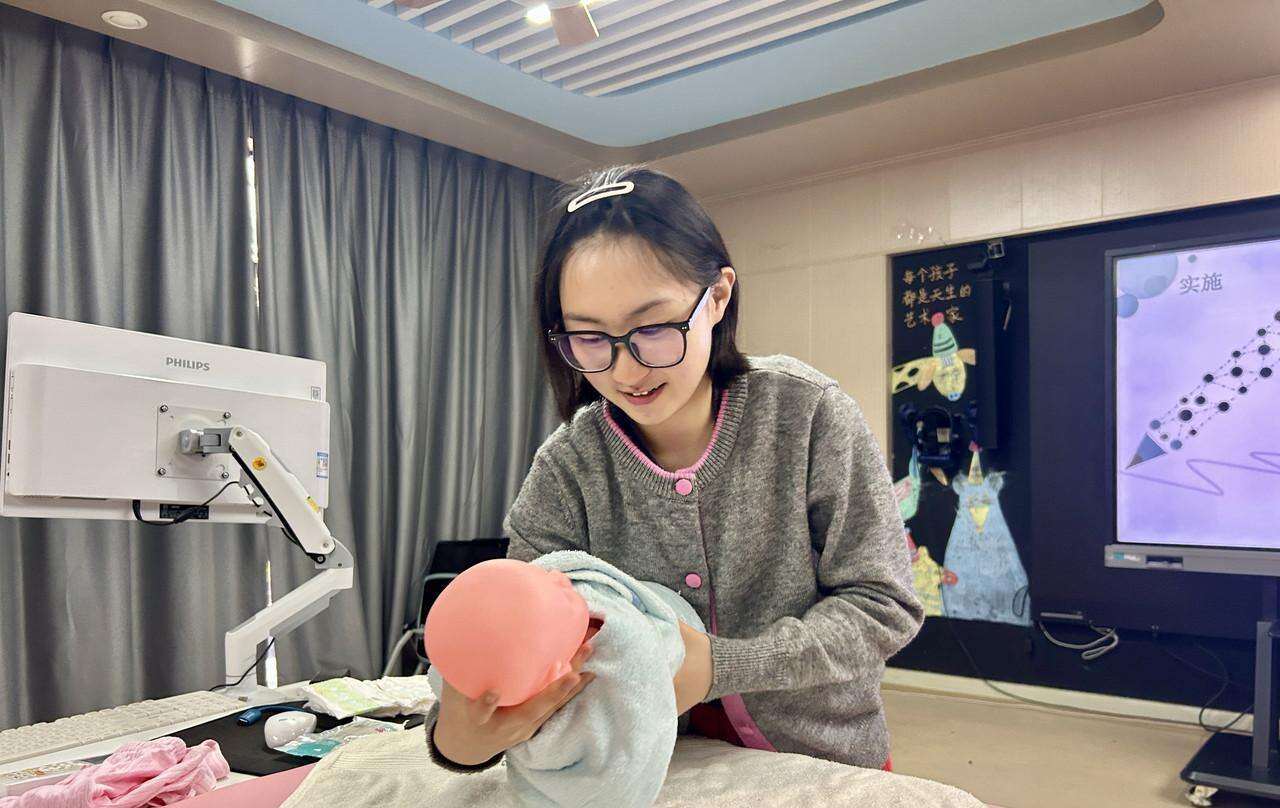 “婴幼儿皮肤娇嫩,代谢旺盛,沐浴不仅能帮助其清除污垢,还能预防感觉统合失调。”课堂上,专业课教师钟燕一边演示,一边拆解流程,单是准备工作就有近十步。“沐浴时,先用毛巾的四个角分别对婴幼儿两颊、双耳进行擦拭,再清洗头部,最后洗身体,每个环节都得细,顺序不能乱。”钟燕表示。