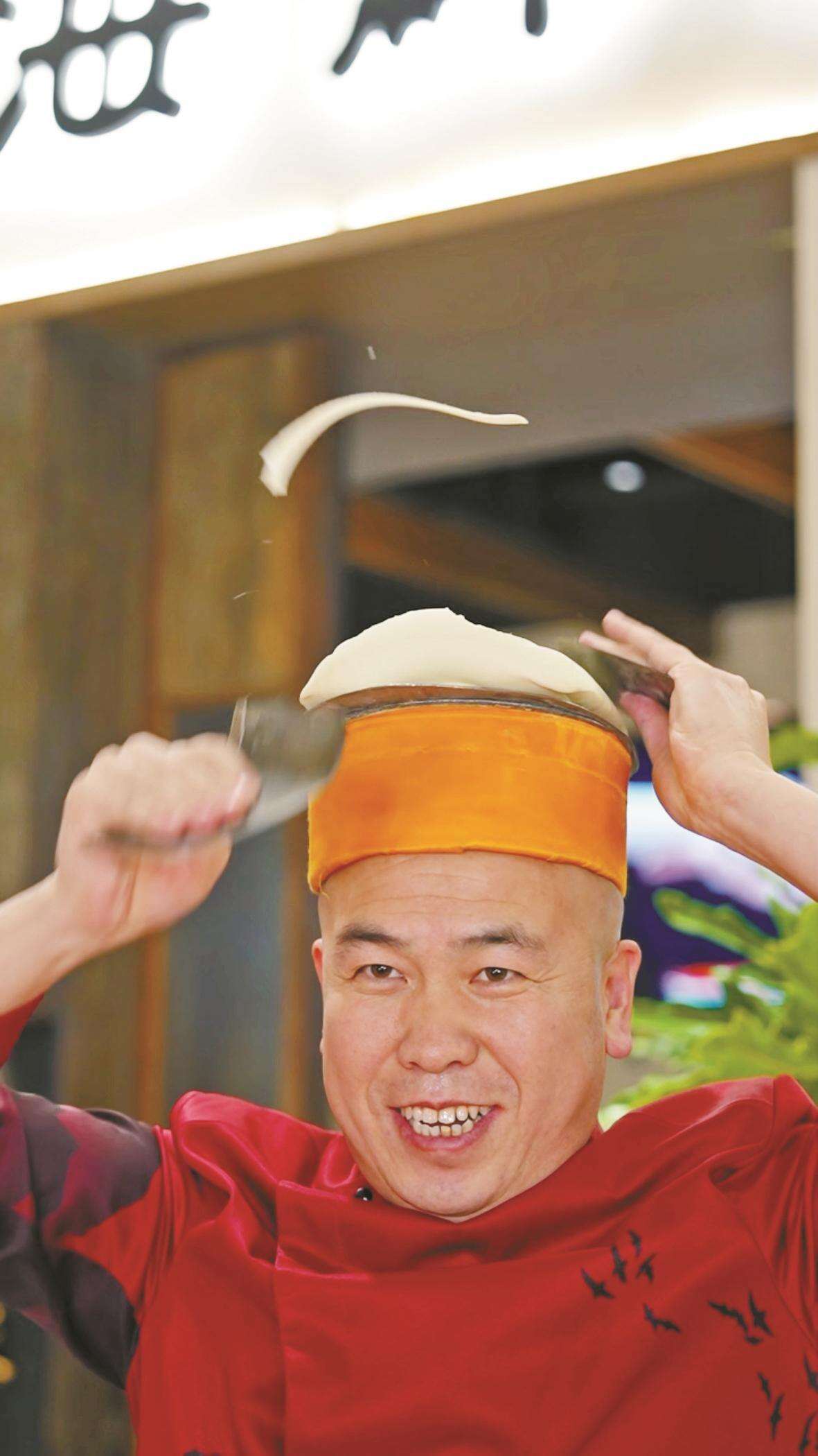 “头顶削面”一开场,就引爆全场。王张龙将揉得光润如玉的面团稳稳戴在头顶,双手各持一把薄刃削刀,手腕翻飞间不见丝毫犹豫。面团在头顶微微转动,银刃划过之处,一根根银鱼似的面条“唰唰”飞泻而下,粗细均匀如标尺量过,带着弧度汩汩落下。观众屏息凝神,生怕错过任何一个动作,直到最后一缕面条落下,现场才爆发出雷鸣般的掌声。