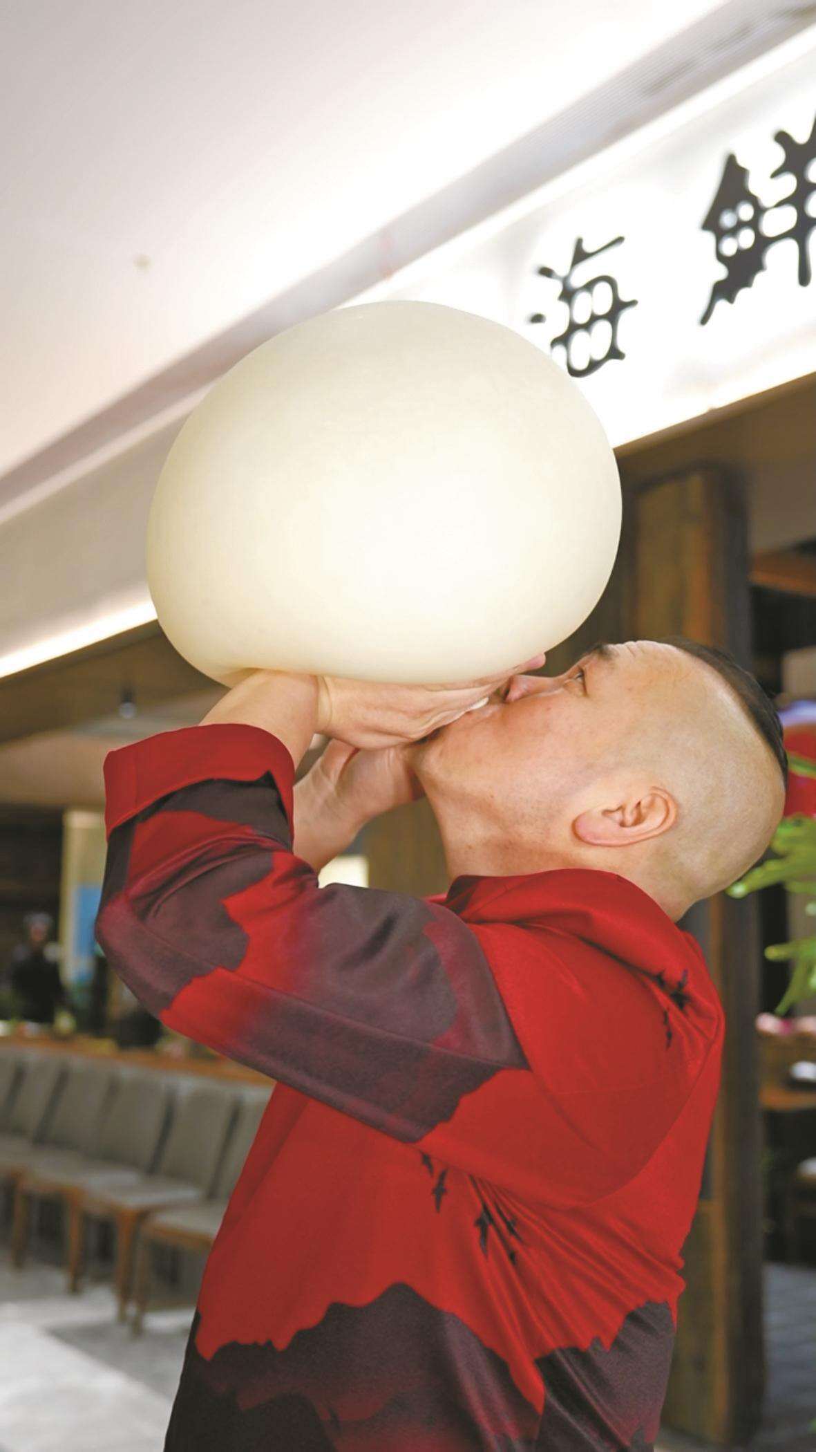 最让人惊叹的是“面团吹球”:王张龙取一小块面团,在手中揉搓片刻,轻轻捏出一个薄如蝉翼的面坯,随后鼓起腮帮缓缓吹气。神奇的是,那面坯竟在气流中慢慢膨胀,从核桃大小变成拳头大,最后竟吹成有面盆大小的一个球,晶莹剔透得能隐约看到内部的纹路,他还提着面球轻轻晃动,面球始终保持圆润。更绝的是,王张龙拿出菜刀,以薄如蝉翼的面球为底板,在它上面切起了黄瓜,只见黄瓜成片,面球却没有丝毫破损,现场观众纷纷拿出手机记录这不可思议的瞬间,忍不住惊叹“这手艺也太绝了”。