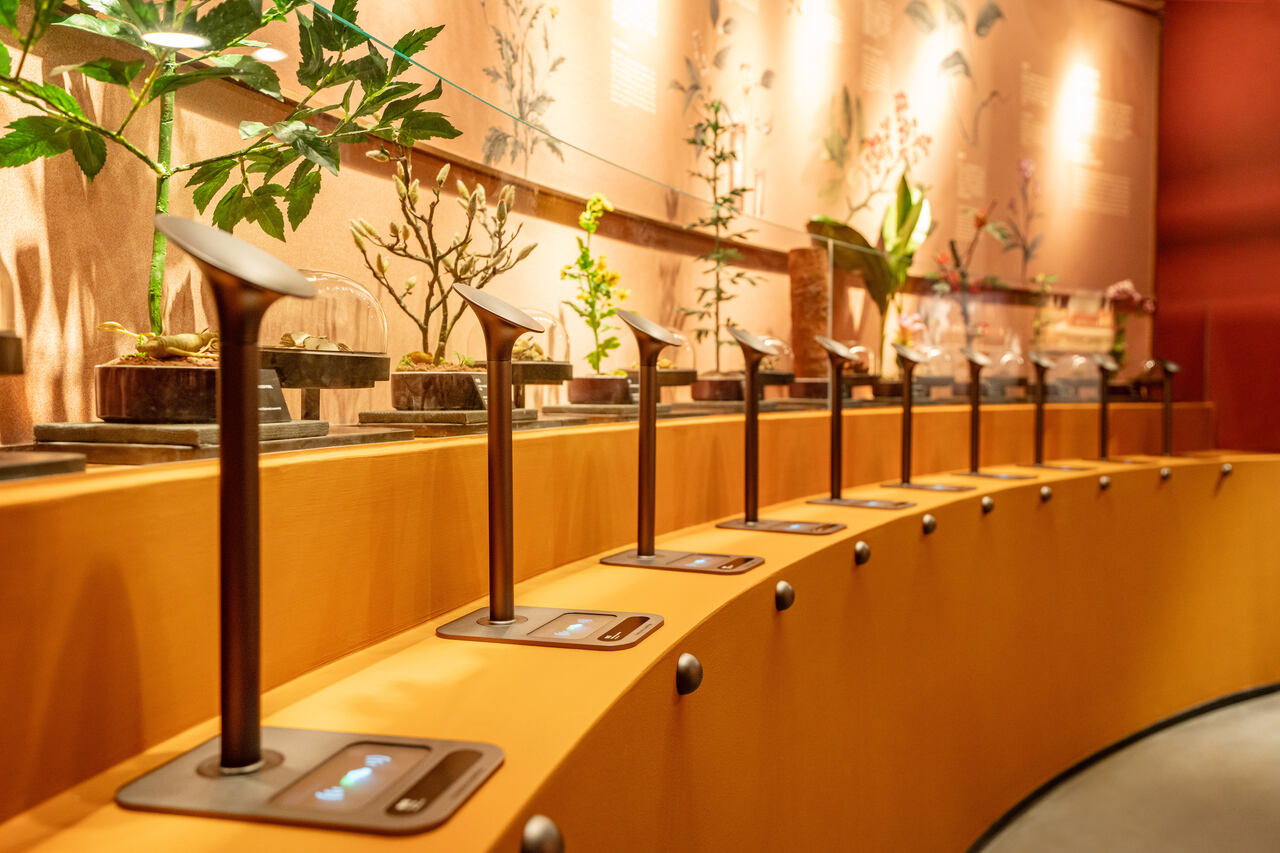 馆内共六层,常设两大展览——《世界用香博览》和《香的通感探索》,分布着300多台闻香机。“只要刷下‘闻香卡’触发装置,设备会迅速从喇叭口吹出展项对应的气味,每次释放10秒。”香氛博物馆副馆长翁彤说。