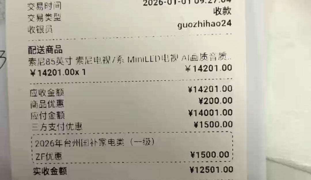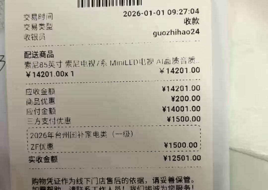 2026年1月1日,新一轮全国家电“以旧换新”补贴政策正式启动。上午9点,家住台州的李先生就来到京东电器城市旗舰店台州店,在顺利领取国补资格后,当场下单了一台索尼大屏电视。这不仅是他个人的“新年第一购”,也成为2026年度国补落地浙江后,京东在全省承接的首单消费。