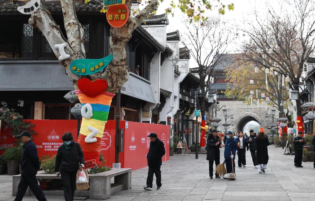 “因为秋冬季树叶凋零,街区略显萧条,为提升游客体验、增强互动感,团队决定以毛线、彩带等材料为大树‘织毛衣’。”浙江衢州南孔文化创意传播有限公司负责人吕晓孟介绍,“装饰主要采用红、粉等明亮色系,希望通过这种富有童趣的方式,为古城注入更多温暖与活力。”