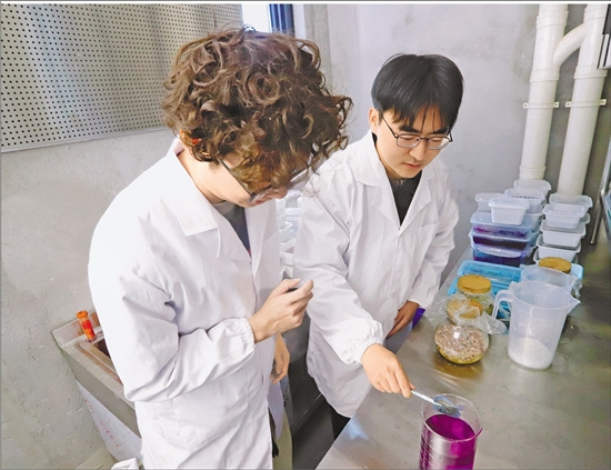 见习记者郑宇(右)制作鱼类透明骨骼标本。 通讯员 周骁 摄