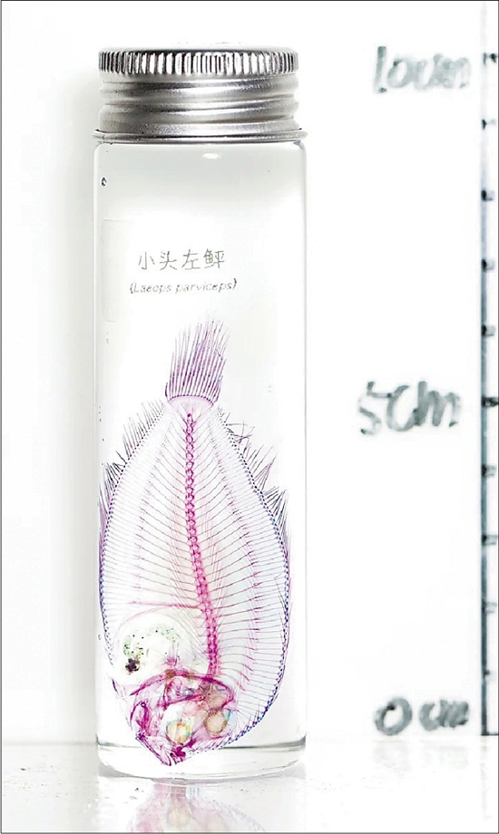 我们将那条经过预处理的小头左鲆轻轻浸入蓝色染液中。经过一夜静置,我们看到,小鱼的鱼鳍基部、眼眶与口鼻处的软骨已被染出淡蓝色。“一般这样大小的鱼,两天左右就能染透。”赵宸枫用手电筒照着玻璃瓶仔细观察一阵后说道。