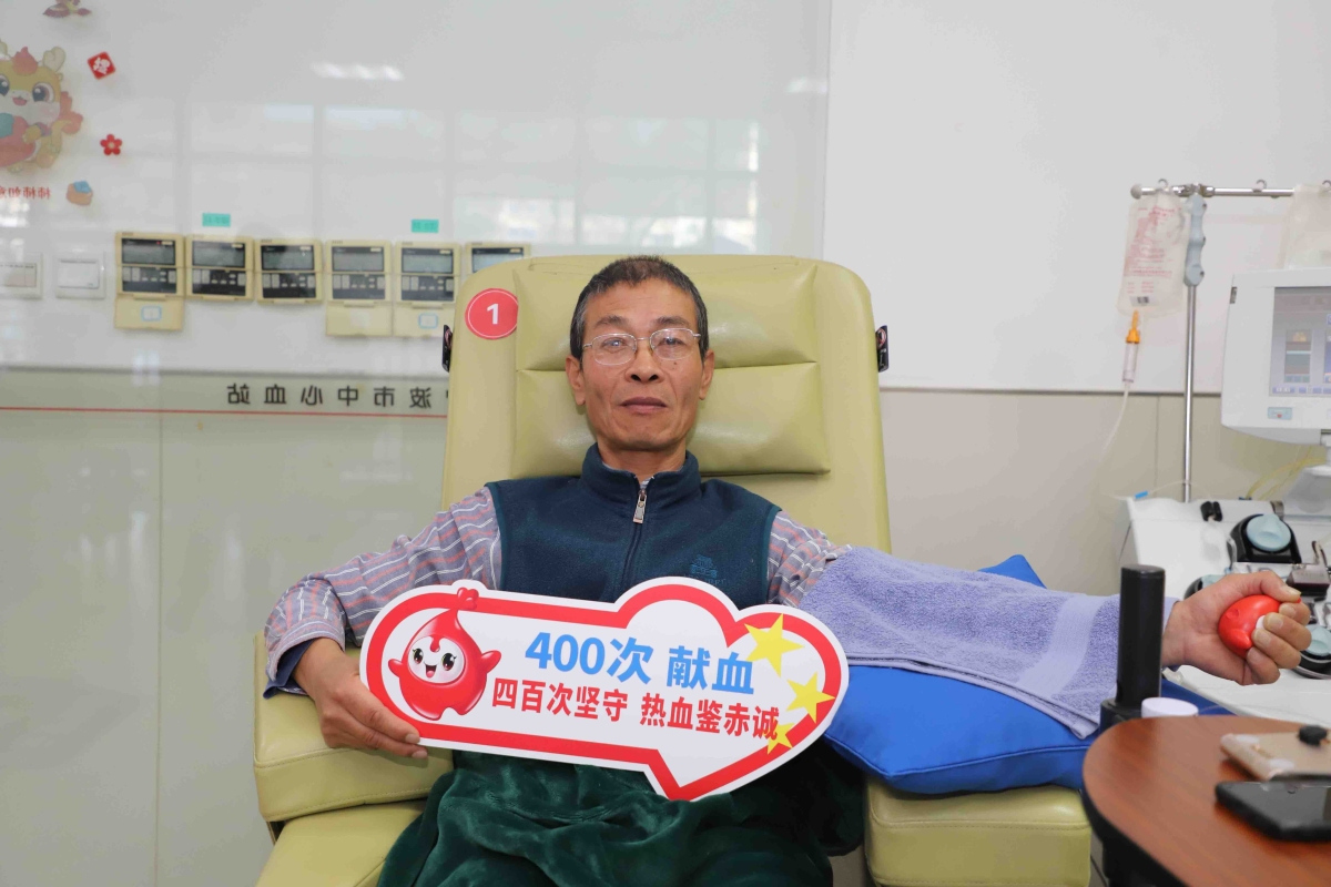 1月12日早上,宁波市中心血站献血大厅,56岁的夏甬峰躺在献血椅上,完成了自己的第400次献血。