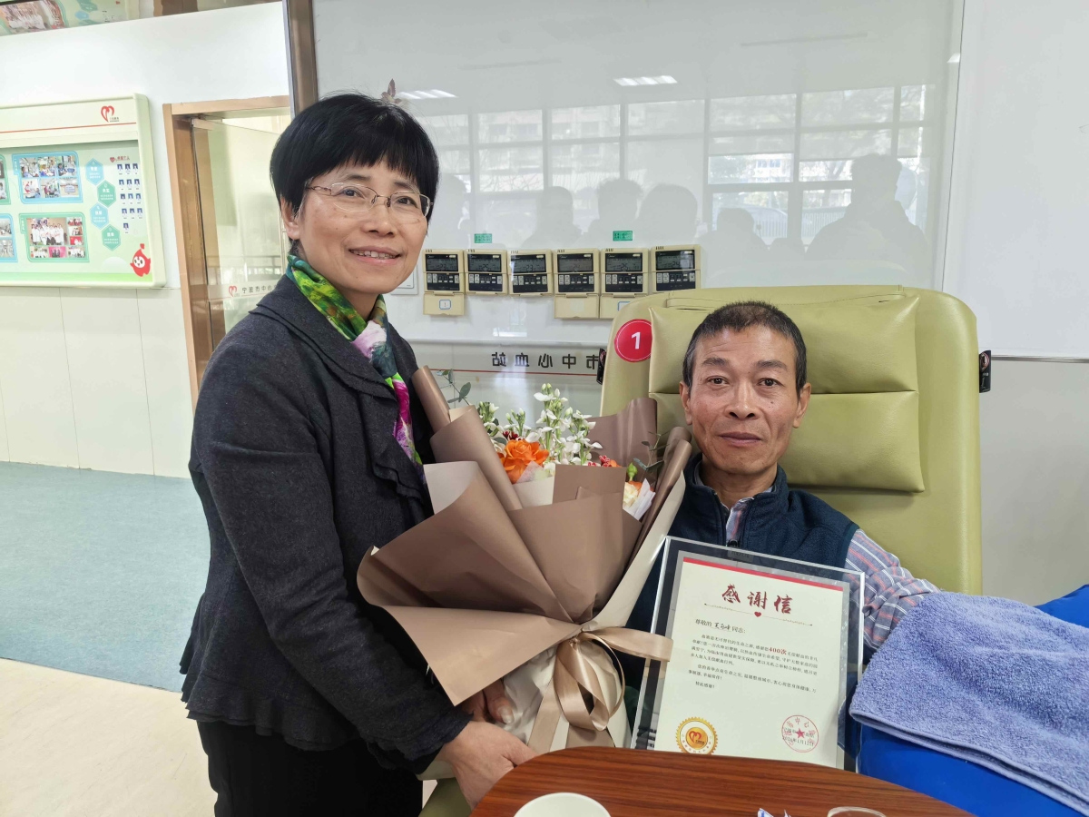 宁波市中心血站站长章晓军向老夏献花表示感谢。