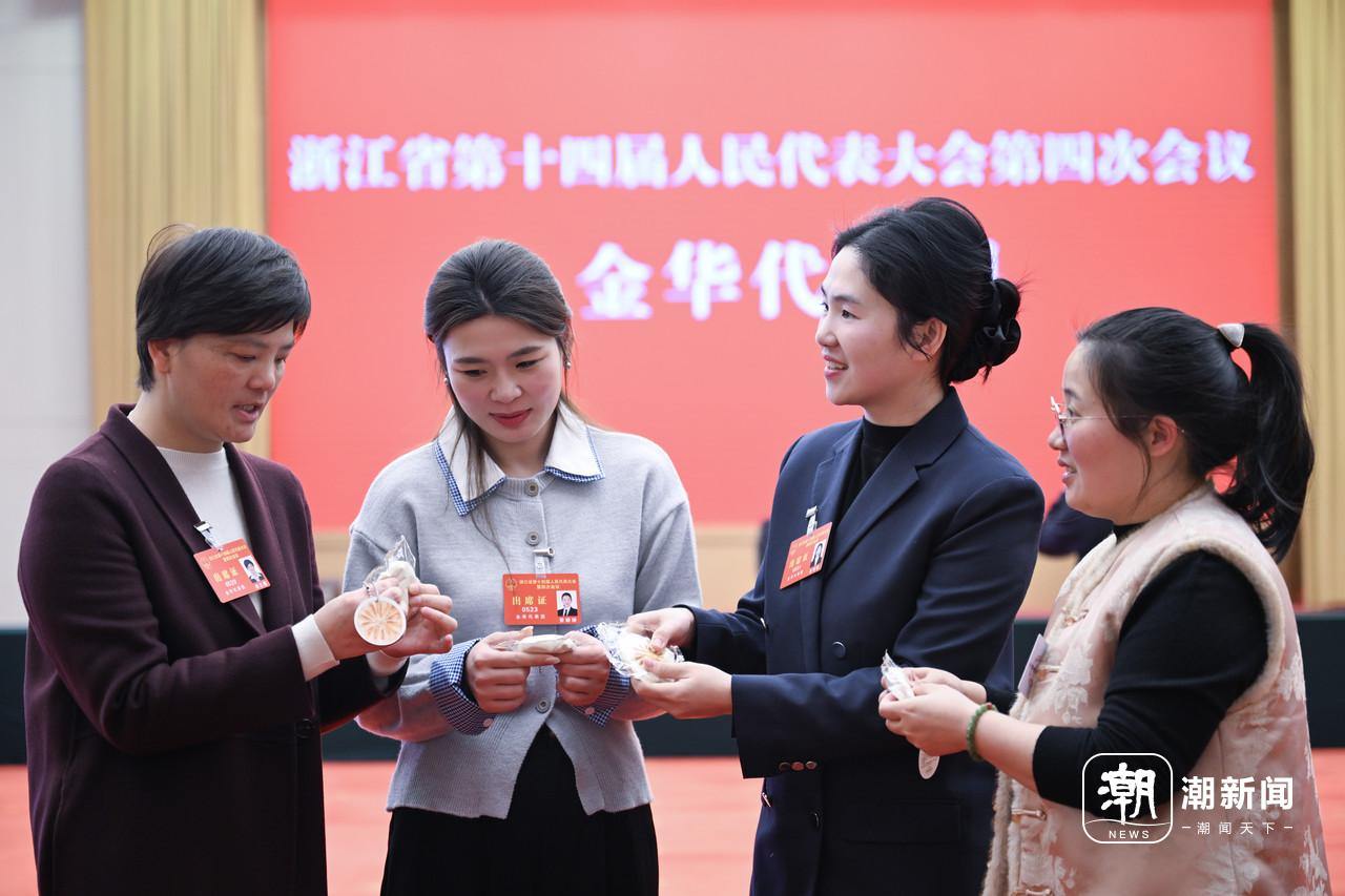 省人大代表吴明明(右二)与代表们分享永康肉麦饼解压玩具。记者 梁臻 摄