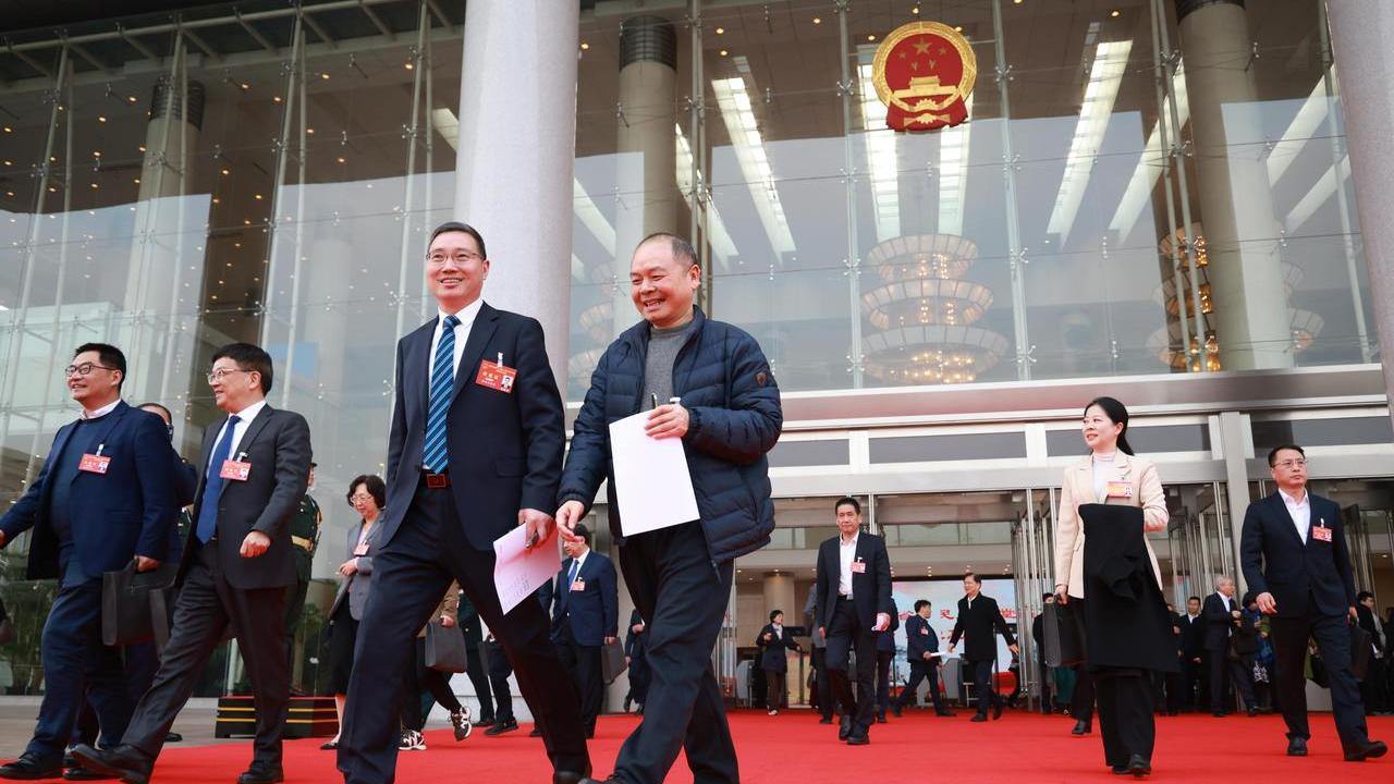 1月17日,浙江省第十四届人大四次会议圆满完成各项议程,在省人民大会堂胜利闭幕。代表们满怀信心,步出会场。