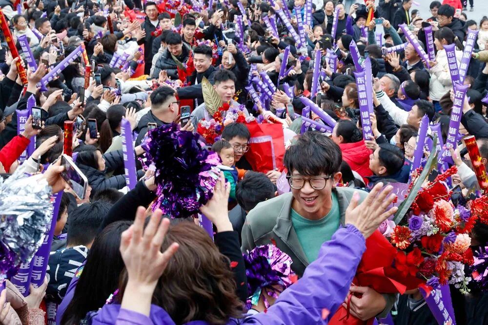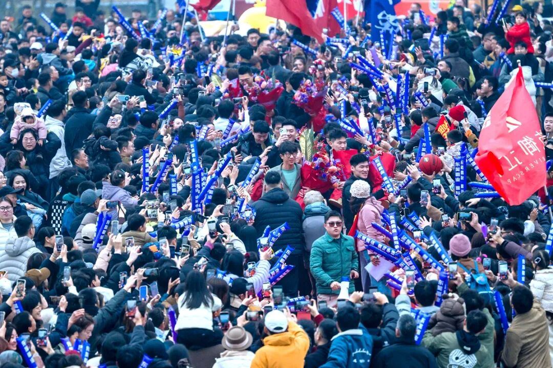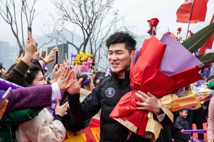 下午两点多,大巴车的车门一打开,外面的锣鼓声、欢呼声就涌入车厢。队员们手持鲜花与球迷们一一击掌致意。很快,球员们被球迷里三层外三层围住。