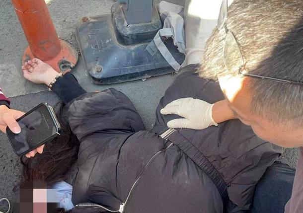 伤者是一名约十八九岁的女孩,仰躺在地,已无意识,头面部有大片血迹。表明红十字应急救护讲师身份后,李志飞快速戴上手套,用三角巾垫住女孩头部,防止可能存在的颅骨损伤加重。