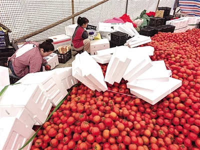 1月16日临近正午,灵溪镇塔里村的番茄代销点一片忙碌。当地农户阮先生种植近50亩大棚番茄,出产的果实堆了一地。两名工人正将他家清早采摘的果实熟练地装箱打包,这些番茄当天就将发往市场。