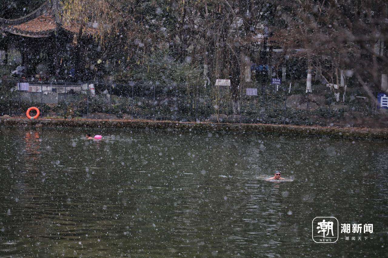 雪花纷飞下的冬泳爱好者。潮新闻 记者 汪驰超 摄