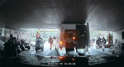 面包车卡在桥下 6个过路人纷纷钻进车厢……