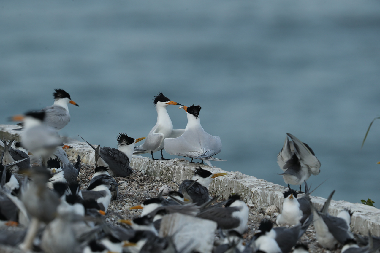 就在此时,丁鹏发现头顶飞来近50只大凤头燕鸥。“这可能是个好兆头,因为中华凤头燕鸥常与它们混群繁殖。”于是,他又坚持了几天,中华凤头燕鸥出现了!