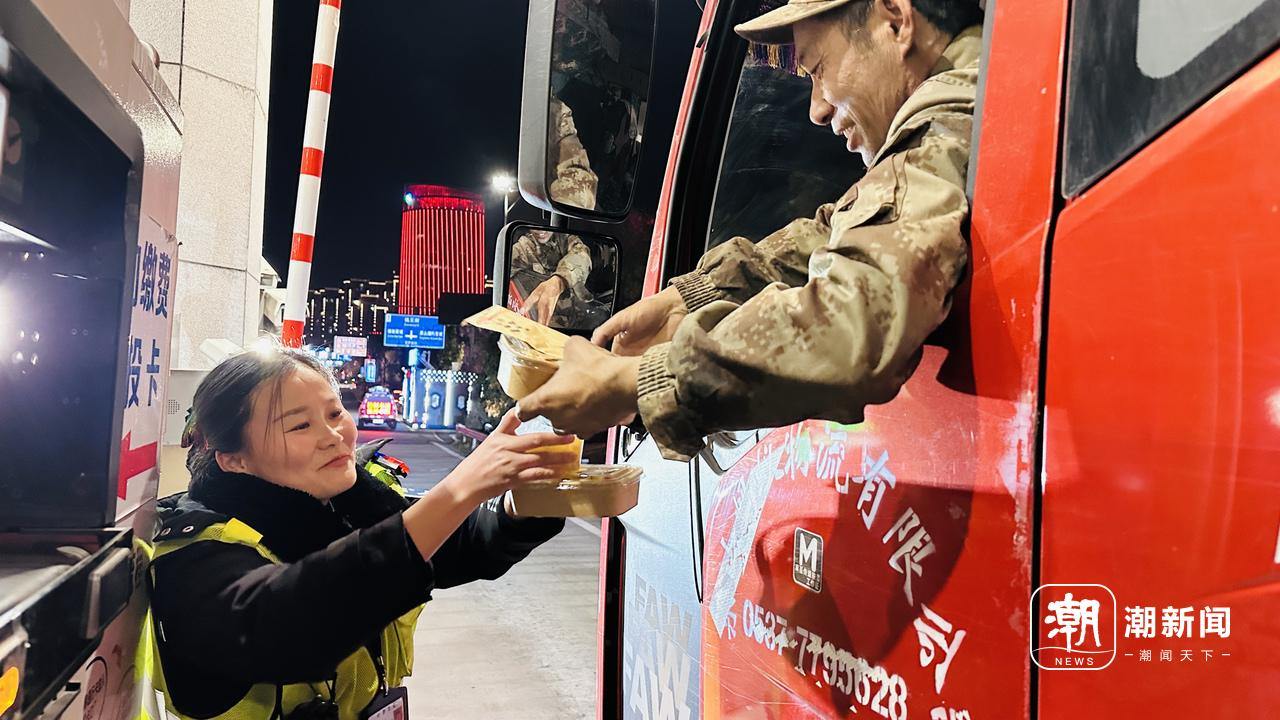 1月22日晚,收费站出入口岗亭旁。见到货车司机,收费员们便踮起脚尖,笑盈盈地向驾驶室里递上打包好的“暖胃三件套”。