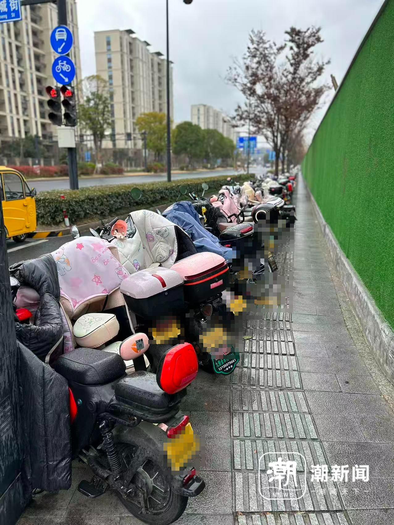 上午9点,记者在科城街靠近友爱路十字路口处看到,道路一侧80米范围内,密集停放着各类电动自行车。