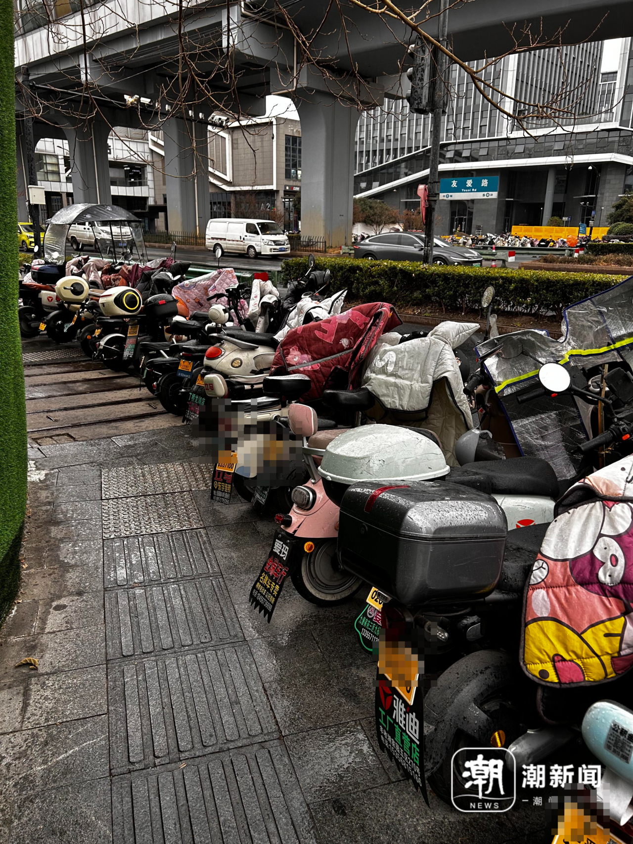 友爱路地铁站附近的人行道上,也有大面积电动车停放。记者 陈朴风 摄