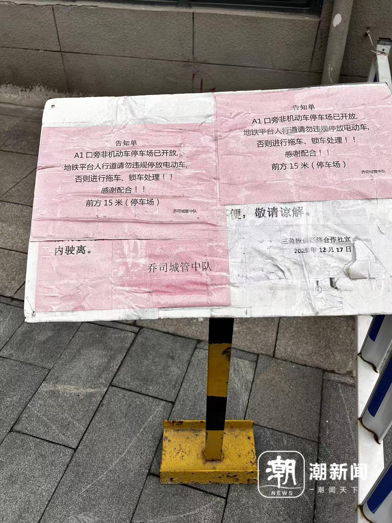 记者在地铁乔司南站A口前发现,乔司城管中队已张贴告知单,明确告知非机动车需停放在指定停车场,人行道违停将面临拖车、锁车处理。