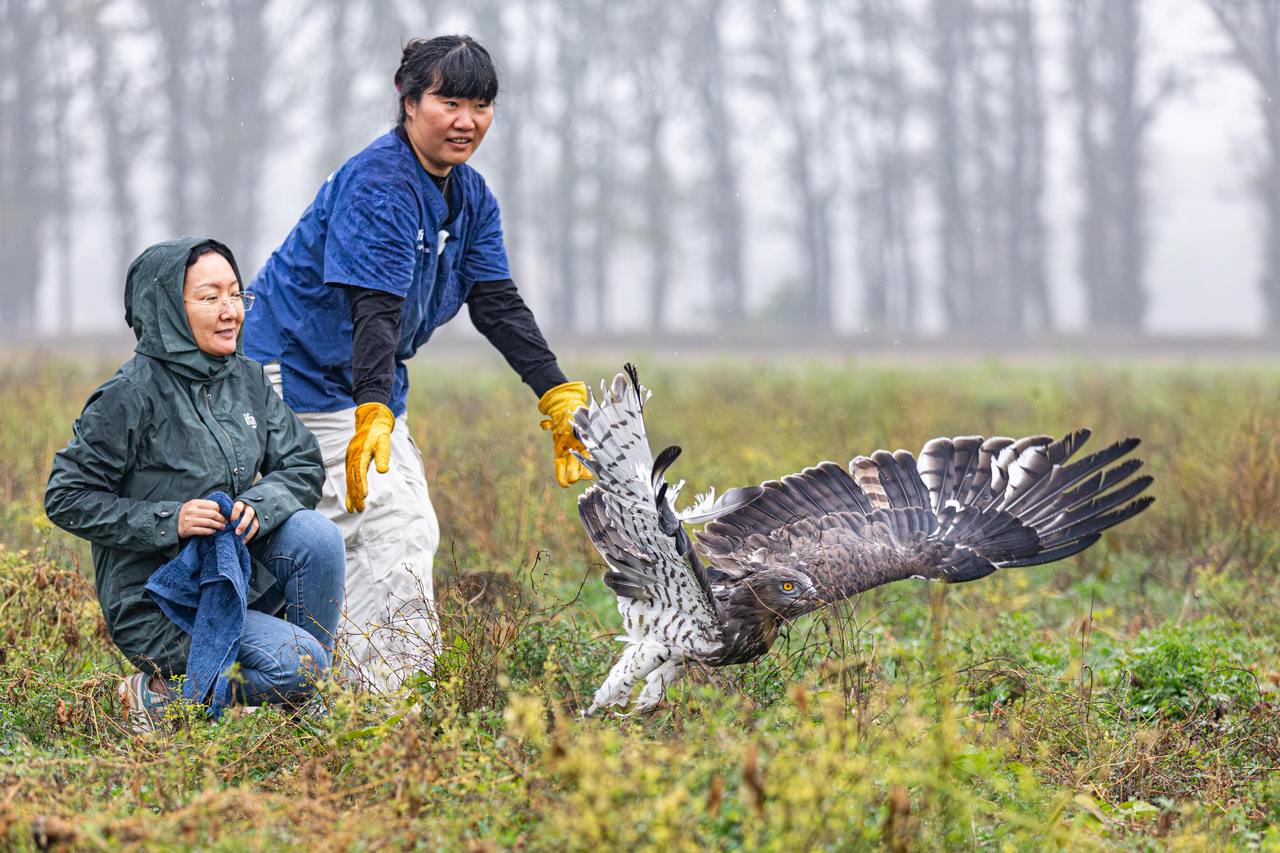 北京猛禽救助中心康复师将康复的短趾雕放归野外。受访者供图