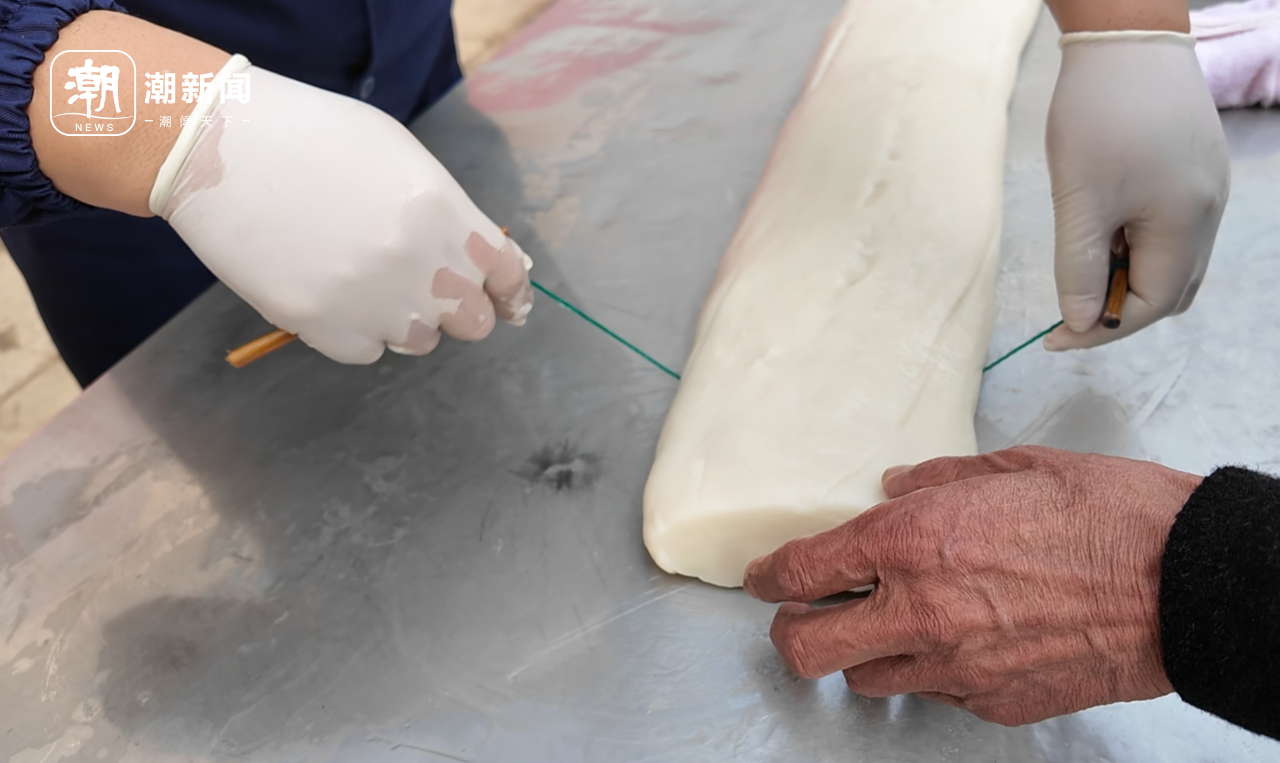 捶打好的年糕被抬上做糕台,立刻有老师傅开始对它进行整形,分割年糕不用刀,线绳在一绞一拉之间就麻利地分割成大小基本相等的年糕块,然后用手搓成长宽厚薄适中、底面平滑,便于以后刀切的大年糕,就算完成。